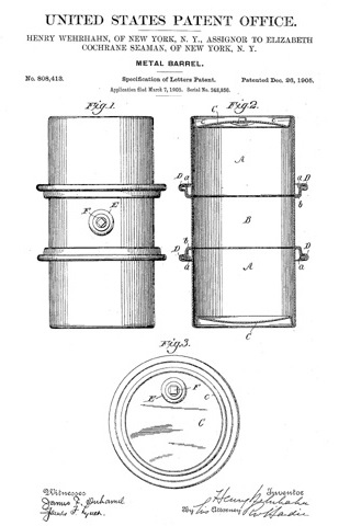 A man by the name of Henry Wehrhan, who was working for Ironclad Manufacturing Company, applied for a couseveral patents of steel barrels, replacing the then industry-standard wooden barrels of the day. These patents would eventually go on to be developed into the modern 55-gallon steel drum.