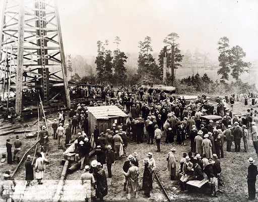 The Lathrop No. 1 Well, seen here, was drilled 15 miles north of the Lou Della Crim No. 1 Well, confirming that the East Texas oilfield was larger than most had believed.