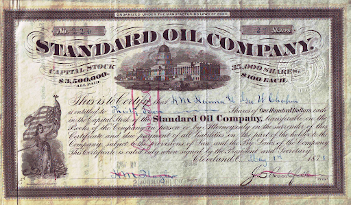 A share certificate for the Standard Oil Company. In 1882, four years after this certificate was issued, Standard Oil would be reorganized into a trust in response to government efforts to limit the size of companies.