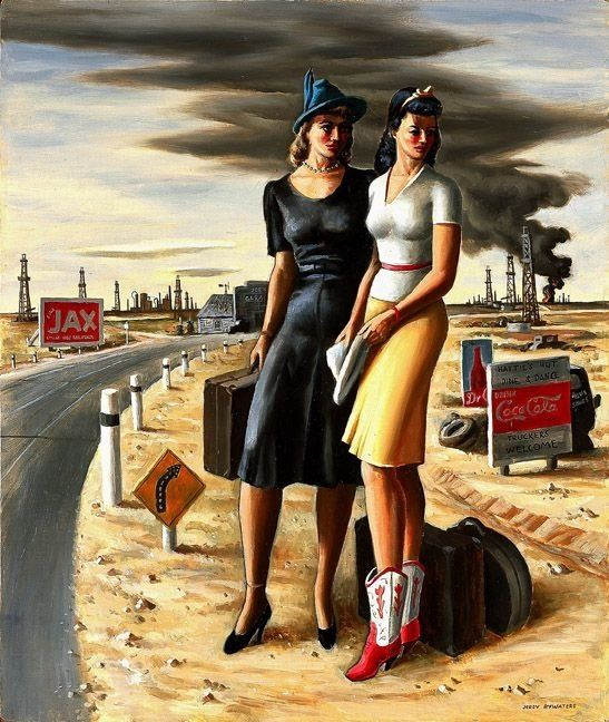 The now infamous Oil Field Girls painting by Jerry Bywaters debuted in 1940. The unveiling took place at San Francisco’s Golden Gate International Exposition in the Fine Arts Palace. This painting featured two young women in a booming oil patch in West Texas and quickly became one of Bywaters’ most popular works.