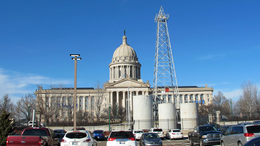 A working oil rig is located right in front of the Oklahoma State Capitol.